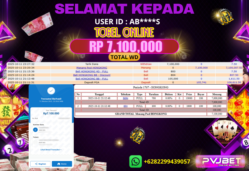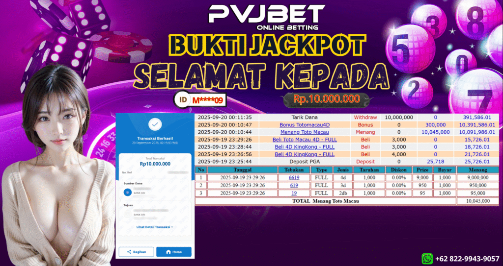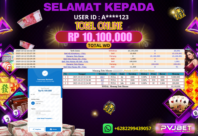 Pvjbet.com merupakan salah satu dari bandar togel online terlengkap dan terpercaya di indonesia yang memiliki pasaran taruhan dari pasaran sydney, singapore sampai hongkong yang populer. Mengawali perjalanan karir dengan misi memberikan kepercayaan kepada member dan kini telah menjadi situs pasang TOGEL ONLINE terbaik.
