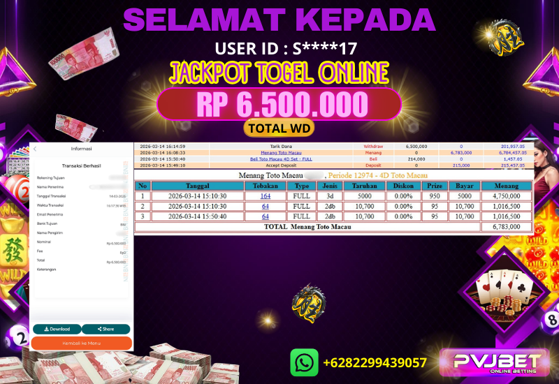 Selamat kepada User id : S****17 Telah berhasil mendapat kemenangan sebesar 6,500,000 Pada permainan TOGEL ONLINE “ TOTO MACAU ”.