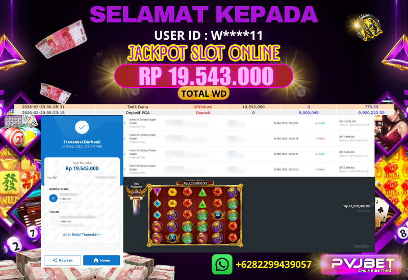 Selamat kepada User id : W****11Telah berhasil mendapat kemenangan sebesar 19,543,000 Pada permainan SLOT PRAGMATIC “GATES OF OLYMPUS SUPER SCATTER ”.