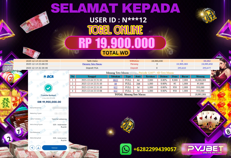 Pvjbet.com merupakan salah satu dari bandar togel online terlengkap dan terpercaya di indonesia yang memiliki pasaran taruhan dari pasaran sydney, singapore sampai hongkong yang populer. Mengawali perjalanan karir dengan misi memberikan kepercayaan kepada member dan kini telah menjadi situs pasang TOGEL ONLINE terbaik.