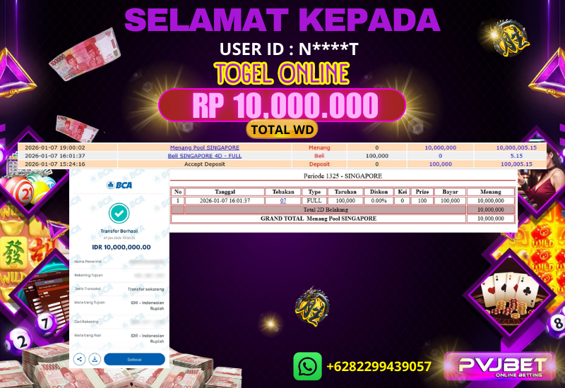 Selamat kepada User id : N****T Telah berhasil mendapat kemenangan sebesar 10,000,000 Pada permainan TOGEL ONLINE “ SINGAPORE POOL ”.